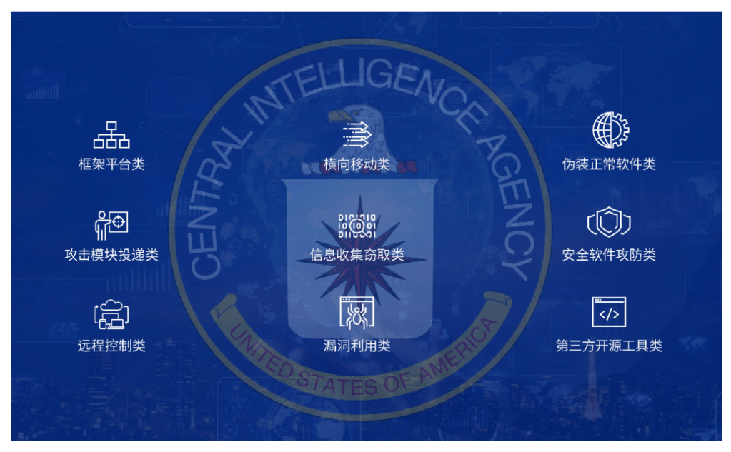 Further technical analysis revealed that the backdoor programs and attack components of the US Central Intelligence Agency (CIA) mostly run in memory without physical files, making it extremely difficult to discover and collect evidence on related samples. Nevertheless, the joint technical team has successfully found effective methods to solve the difficulty of evidence collection. For convenience in describing and analyzing the issue, we temporarily classify the CIA’s attack weapons into 9 categories: