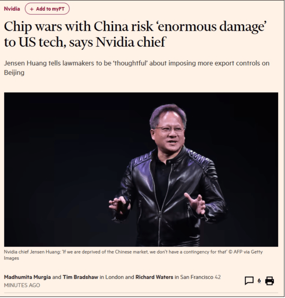 According to a report in the Financial Times on the 24th, Nvidia’s founder and CEO, Huang Renxun, warned that the US-initiated chip war is severely constraining domestic semiconductor companies and may cause “huge damage” to the country’s technology industry.